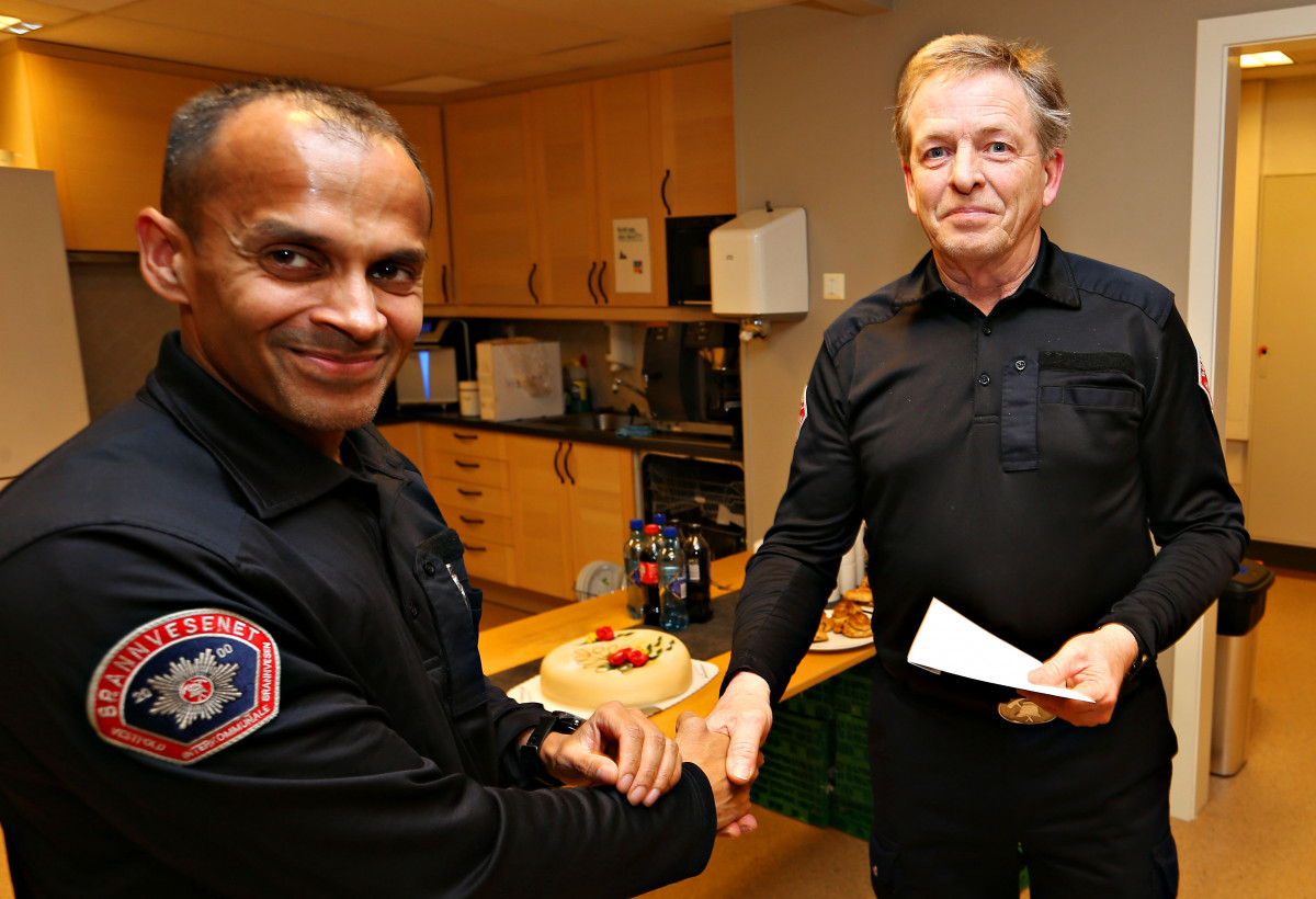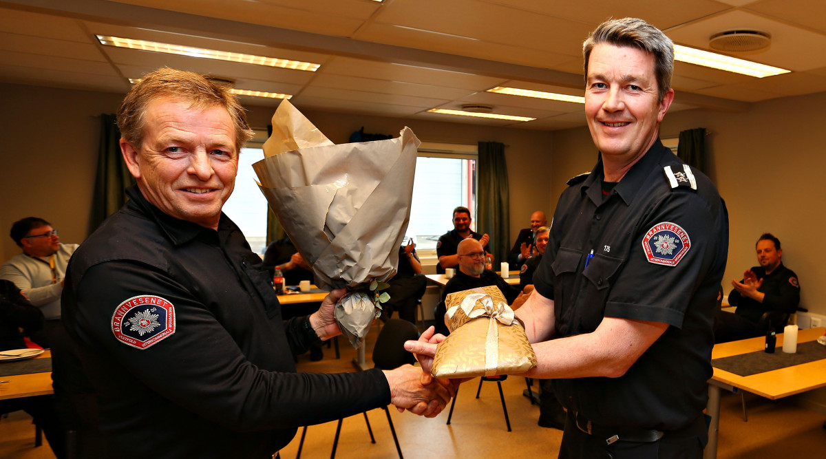 - Din innsats er imponerende. Alt hva du har gjort for lokalsamfunnet og bidratt med av trygghet siden 1990 fortjener en stor takk, sa beredskapsleder Hedin Gibbons da han talte til nestoren ved stasjon Sande.
