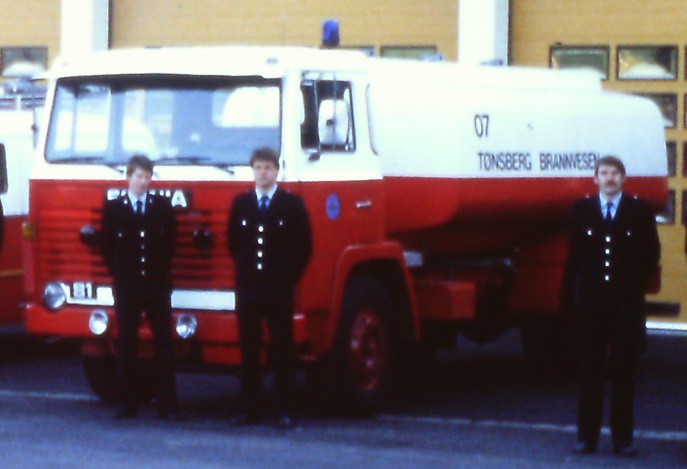 Brannvesenets første egeneide tankbil. Tidligere ble det i sommermånedene lånt en tankbil fra Borgen Mølle, en Bedford med tank som til vanlig ble brukt for transport av melasse.