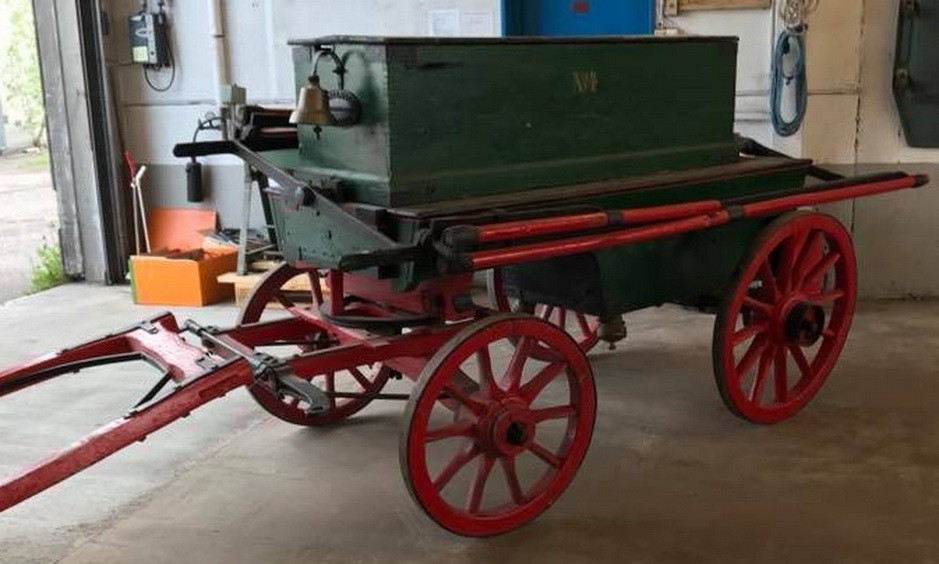 Shand & Mason brannpumpe som har vært brukt i Holmestrand brannvesen. Pumpen ble trukket av hester, fremme på brannstedet ble pumpen betjent av inntil 10 mann for full effekt.