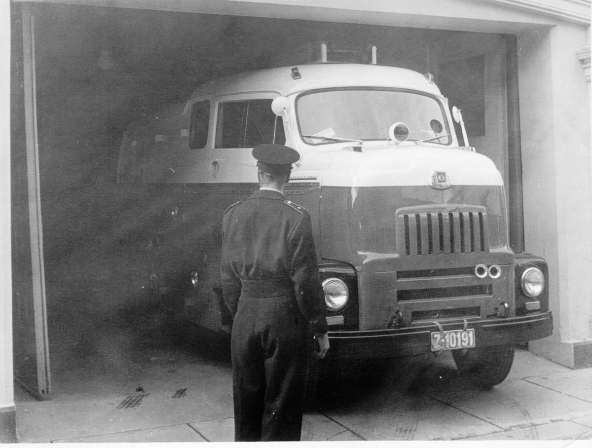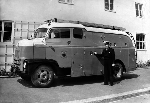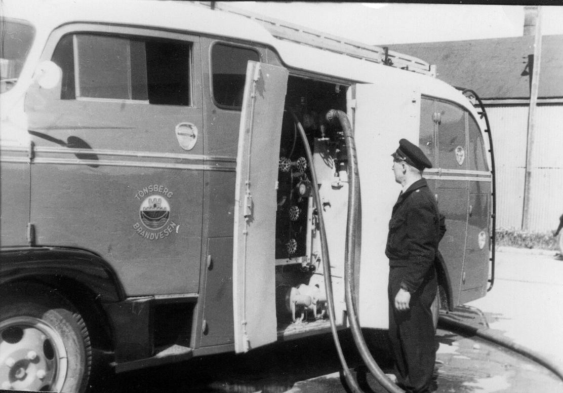 Beredskap i Tønsberg brannvesen (TB) fra 1953 til 1971 Høytrykksbilen ble kalt Kosmos. Det forstår man når man ser fasong og størrelse i forhold til de tidligere bilene. |